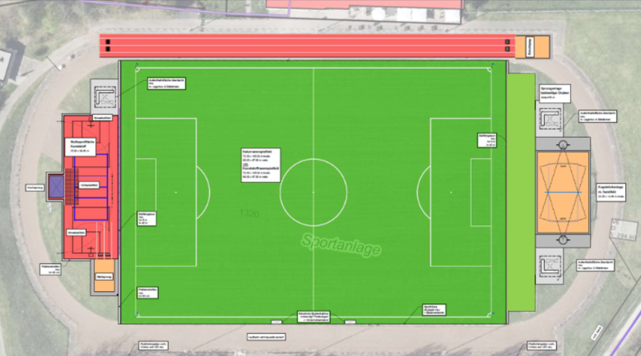 - an den Stirnseiten des Kunstrasens soll auf der einen Seite ein Basketballfeld und auf der anderen Seite ein Beachvolleyballfeld entstehen